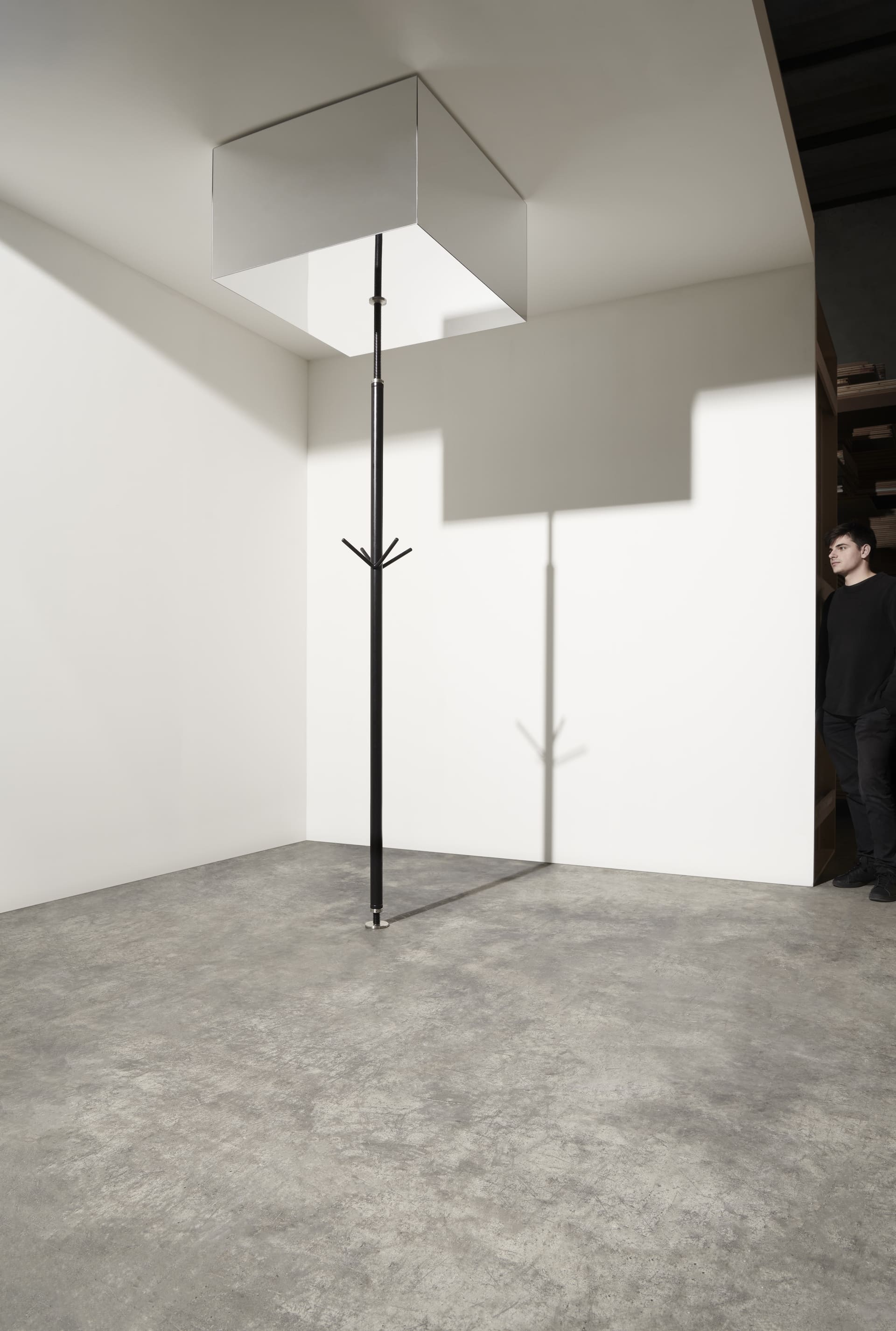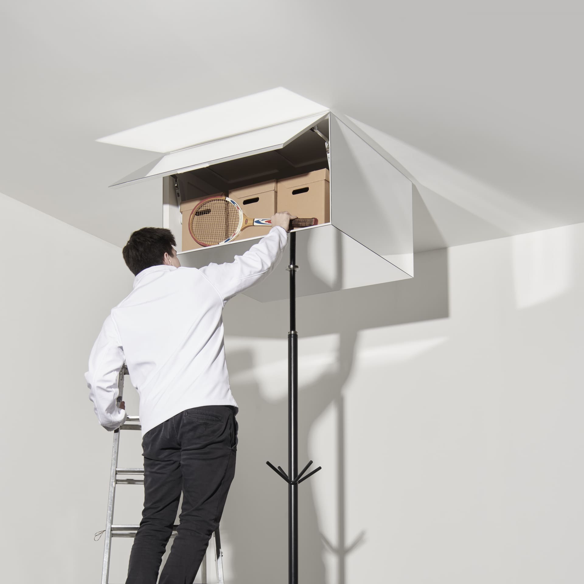 Lo storage system Pole, utilizza l’altezza degli spazi e il sistema di fissaggio tra pavimento e soffitto per dare vita a un utile elemento d’arredo. Il palo centrale di sostegno è un appendiabiti mentre il volume sopraelevato è un ampio spazio di archiviazione. Quest’ultimo, grazie alla finitura specchiante si smaterializza fondendosi con l’ambiente circostante. Con la sua estrema versatilità, Pole è in grado di adattarsi a soffitti con un’altezza da 2.70 a 3.10 metri.